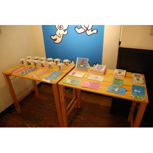 こちらはグッズコーナーです。マグカップやポストカードの他に、私がジャケットを担当させていただいたCD「everybody known songs.」も販売しました。もちろん、会場のBGMは、このCDです(笑)。
