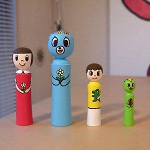 21日から参加させていただく『こけし展』に向け、木製のこけしにイラストを描きました。写真のように、大小4つ。