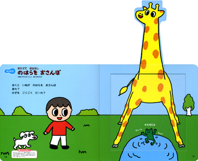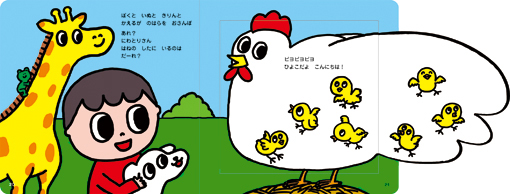 ベネッセさんの0・1歳児親子用の絵本、ぷちファースト「よみかたり えほん」にてイラストを担当しました。男の子が野原をおさんぽするお話で、隠れている動物たちが出てくる仕掛け絵本になっています。